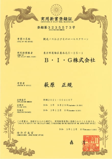 わんちゃん専用バスは、「バス移動」に新しい視点を発見し、今までにない価値をお届けするバス・コミュニケーター 、B・I・G(株)が開発しました。わんちゃんが快適に乗車できるよう、室内の仕様にこだわり、実用新案を取得しています。